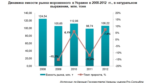 После роста в 2010 году, последовал спад потребления и в 2011 г. рынок значительно просел – до 98,7 млн. тонн мороженного. Однако по итогам 2012 г. отмечается позитивная тенденция роста показателя емкости на 8% в натуральном выражении.