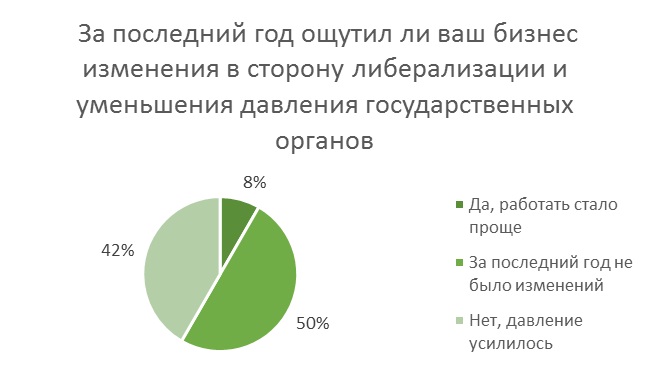 Половина компаний считает, что за последний год не произошло качественных изменений в сторону либерализации отношений компаний МСБ и государства. А 42% опрошенных наоборот утверждает об увеличении давления со стороны проверяющих структур.