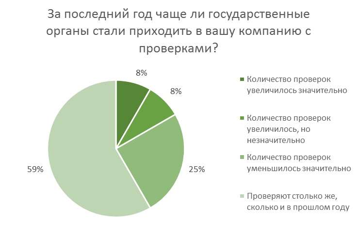 По оценкам 60% компаний проверять их деятельность государство не стало больше по сравнению с прошлым годом. Хотя 8% считают, что количество проверок увеличилось. Возможно дело в секторе экономики и отрасли, в которой работают компании. При этом четверть компаний отметили, что проверять их стали меньше.