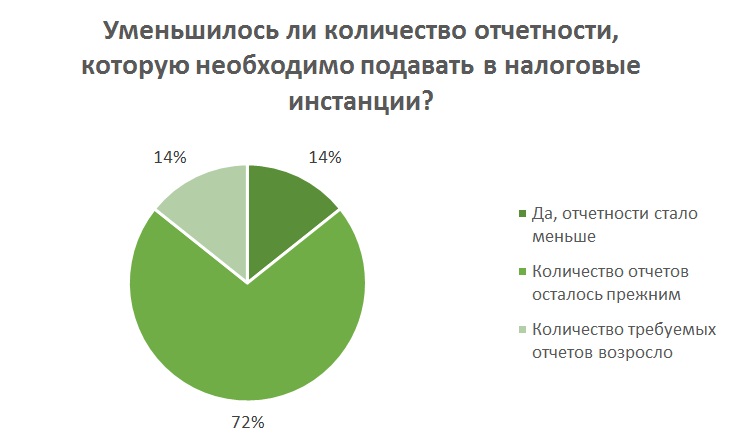 Как отметили компании, количество отчетности, которую требуется подавать государству, осталось на прежнем уровне. Так читают 72% опрошенных предпринимателей. И лишь 14% компаний утверждают, что отчетности стало меньше.