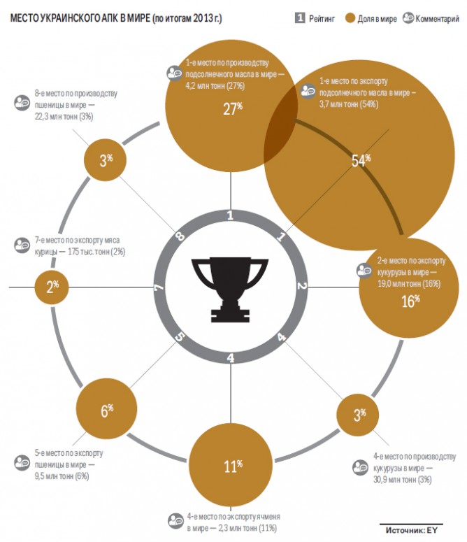 Один из локомотивов отечественной экономики — агропромышленный комплекс — переживает не лучшие времена. Девальвация нацвалюты, новый геополитический расклад, потеря части территории. Все это не могло не отразиться на финансовом здоровье агропредприятий. По словам аналитика инвесткомпании Eavex Capital Ивана Дзвинки, на фоне этих факторов публичные агрокомпании подешевели на 14‑90 %. «Агробизнес сегодня переживает серьезный конъюнктурный спад — мы зависим от внешних рынков, а 46 % падения цен на зерно, мягко говоря, hard style», — говорит финансовый директор Группы компаний «Мрия» Александр Чернявский.