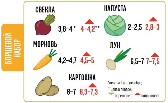 За последний месяц, как и прогнозировали «Вести», цены на борщевой набор выросли. Так, если в ноябре за картошку мы платили 4,5 грн/кг, то сегодня средняя цена на рынке — 6–7 грн. А по сравнению с декабрем прошлого года стоимость второго хлеба выросла в три раза, отметил директор аналитического департамента Pro-Consulting Александр Соколов. Рекордные в этом году цены и на лук — 7 грн за кг. Правда, в последнюю неделю он немного подешевел. «Производители начали открывать холодильники и продавать заложенные на зиму запасы лука», — объясняет руководитель проекта «АПК-Информ: овощи и фрукты» Татьяна Гетьман. В январе эксперты прогнозируют дальнейший рост цен на все овощи борщевого набора.