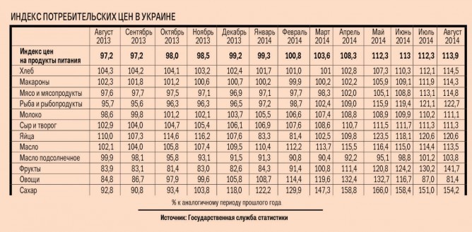 Удешевление еды Украину не затронуло. По данным Государственной службы статистики, индекс цен на продукты питания в нашей стране в августе вырос на 13,9 % по сравнению с аналогичным периодом прошлого года. Например, хлеб в среднем подорожал на 14,5 %, макароны — на 14,3 %, мясо и мясопродукты на 14,8 %, рыба — на 22,7 %, молоко — на 11,1 %, сыр — на 11,3 %, масло — на 13,5 %. Лидерами по росту стоимости стали сахар, который подорожал на 54,2 %, фрукты — на 41,7 % и яйца — на 20,6 %. Цены упали только на овощи — на 19,6 %.