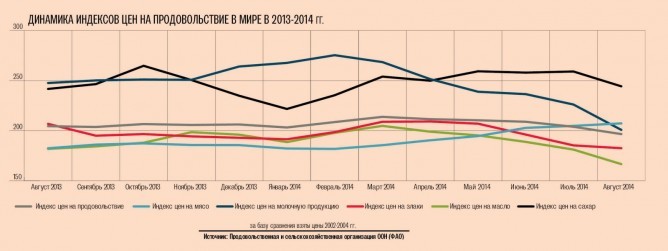 Как свидетельствуют данные экспертов ФАО, индексы всех подкатегорий продовольствия, кроме мяса, в августе заметно упали. В частности, индекс цен на зерновые составил 182,5 пункта, что на 24,2 пункта (11,7 %) ниже показателя августа 2013 г. «Капитал» уже писал о том, что стоимость зерна в мире уменьшилась до четырехлетнего минимума. При этом цены на рис показывали разнонаправленную динамику. В частности, благодаря возвращению на рынок традиционных импортеров, а также в связи с тем, что Таиланд так и не начал с августа реализацию больших объемов своих государственных резервов, рис подешевел.