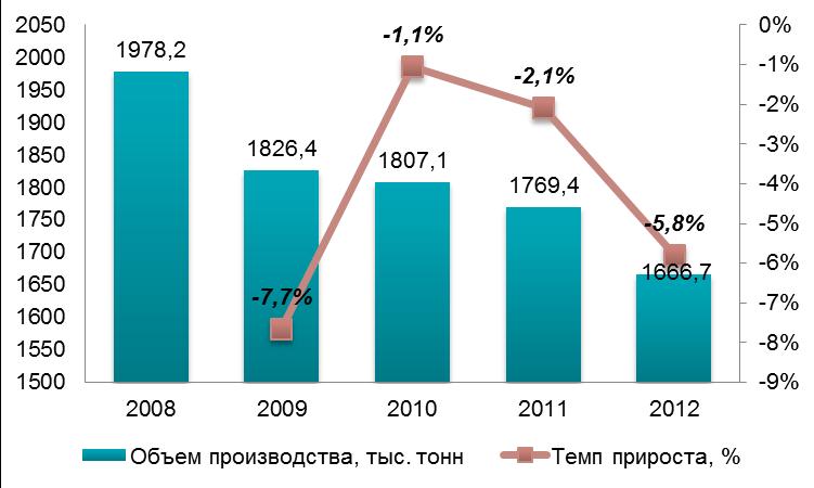 Динаміка виробництва хліба та ХБВ в Україні вже кілька років демонструє негативні тенденції зниження. Найбільше скорочення відбулося в 2009 р. - на 7,7% в натуральному вираженні, що пов'язано з кризовими явищами в країні та прагненням населення максимально скоротити витрати.