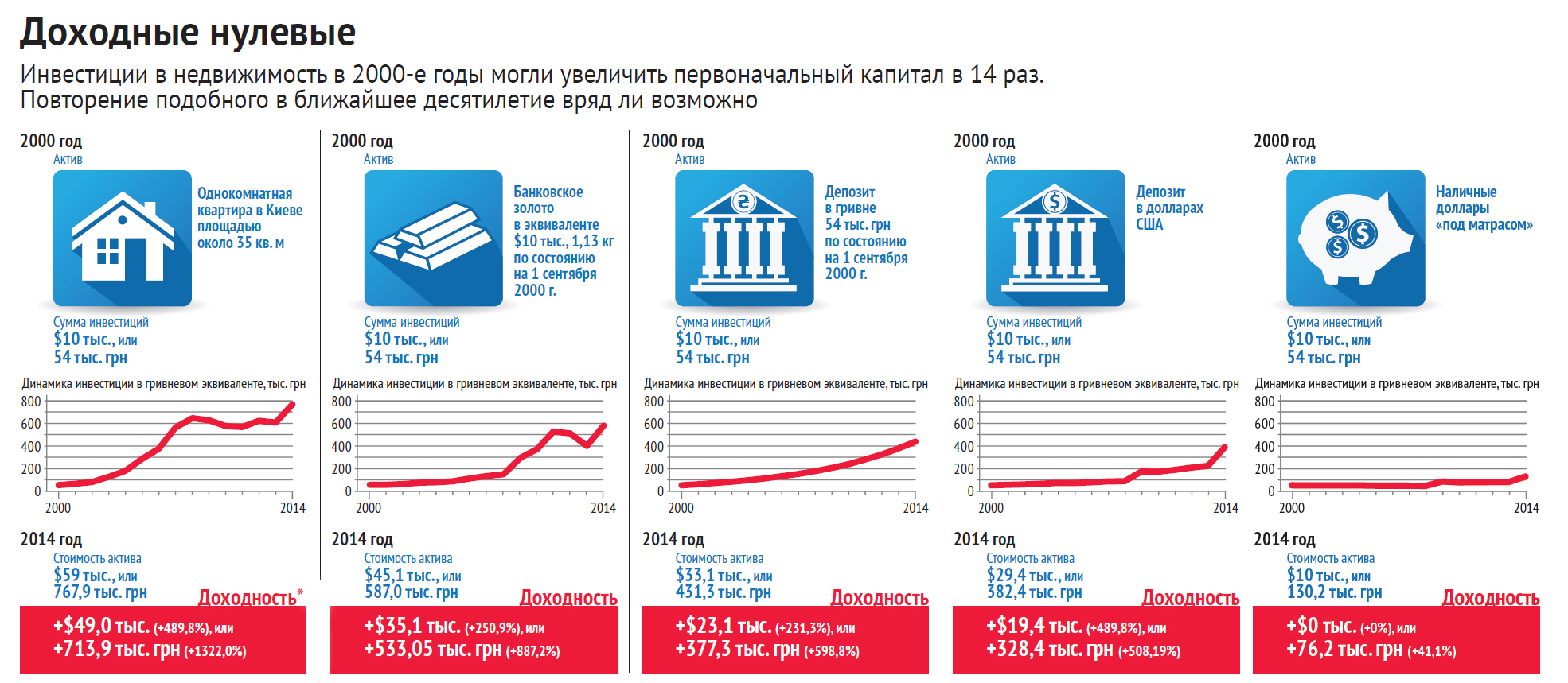 Размещение $10 тыс. на депозитном счету за прошедшие 14 лет принесло инвесторам куда меньшую прибыль, нежели золото и недвижимость. Доходность за весь период по депозиту в гривне (в долларовом эквиваленте) составила около 231%, по вкладу в американской валюте — 194%. "В Украине выгоднее хранить деньги на гривневых депозитах. Если делать это постоянно, доходность вложений будет выше, чем у депозитов в инвалюте, даже учитывая периодическую девальвацию гривны", — констатирует управляющий активами КУА "Драгон Эсет Менеджмент" Алексей Соболев.