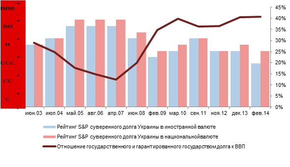 Як видно з діаграми, наведеної вище, станом на лютий 2014 показник співвідношення боргу (державного та гарантованого державою) і ВВП України незначно виріс порівняно з 2011 роком. При цьому суверенний рейтинг України за цей час знизився з В+ до ССС. Це свідчить про те, що рейтинг не є оцінкою загального економічного стану країни, а лише прогнозом ймовірності дефолту, заснованим на оцінці рівня золотовалютних резервів країни і графіка погашення її зовнішнього боргу. На думку Сергія Парпуланського, лютнева рейтингова оцінка України відображає політичну ситуацію тою мірою, якою остання впливає на кредитоспроможність країни. Рейтингове агентство Standard&Poor’s прогнозувало, що політична криза в країні не дасть можливості залучити фінансування, причому як з боку Росії, так і від МВФ, що в підсумку призвело б до дефолту України. Позитивні зміни, які відбулися наприкінці минулого тижня, дадуть Україні можливість залучити кошти МВФ, що дозволить країні розрахуватися із зовнішніми боргами.