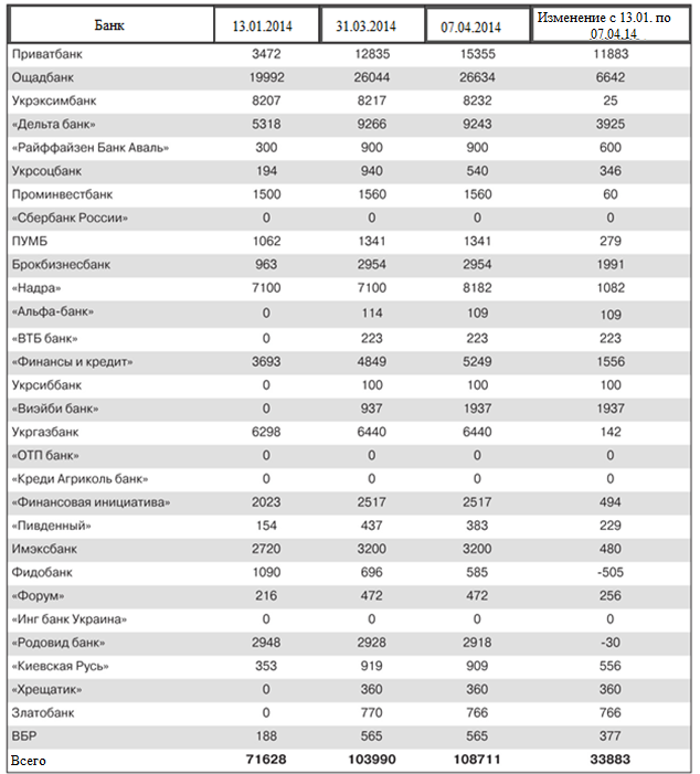 Для забезпечення стабільності банківської системи в умовах масового відтоку депозитів НБУ активно видавав рефінансування; на зазначені цілі за період з початку року до 07.04 було представлено 33,8 млрд грн. Із банківської системи за цей період населення вивело 32,3 млрд грн і 3,2 млрд дол. США. Тобто сума рефінансування дорівнює приблизно половині відтоку вкладів фізичних осіб, що побічно підтверджує його необхідність для стабілізації системи. Малоймовірним виглядає припущення про те, що банки могли масово скористатися цими коштами для спекуляцій на валютному ринку.