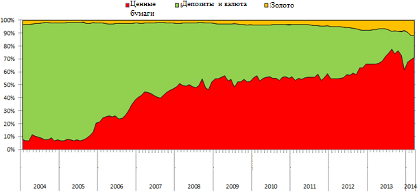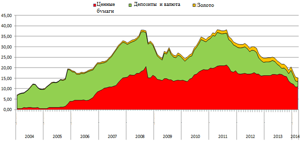 Як бачимо, резерви знаходяться на найнижчій точці з 2005 року, при цьому, що набагато гірше, у структурі резервів критично низька частка валюти і депозитів – найбільш ліквідних інструментів. У тому самому 2005 році за приблизно рівного обсягу резервів їх структура на 90% складалася з валюти. Ми не володіємо інформацією про те, які цінні папери перебувають на балансі НБУ в резервах у 2014 році, але однозначно можна сказати, що вони менш ліквідні, ніж валюта і не можуть бути швидко спрямовані на валютний ринок для підтримки стабільності курсу.