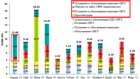 Виплати за облігаціями зовнішньої і внутрішньої позики, а також платежі МВФ в 2014-2015 році