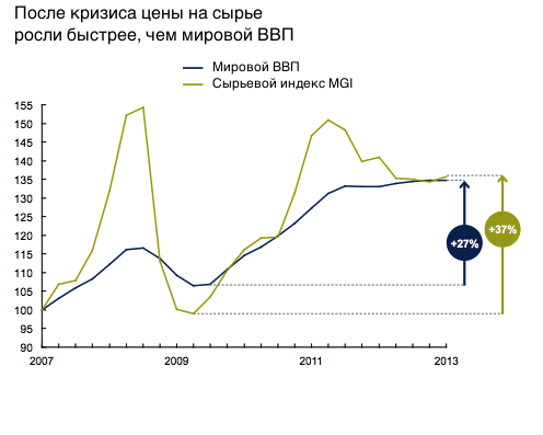 На початку поточного десятиліття ціни на ресурси трохи знизилися, але говорити про зміну тренда занадто рано. Стійко утримується досить високий попит, при цьому ціни ростуть значно швидше за світовий ВВП.