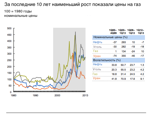 Найменше за розглянутий період підвищилися ціни на газ, а в США, починаючи з 2008 року, вони навіть значно скоротилися через перехід до промислового видобутку сланцевого газу. Ціна на газ значно піднялася тільки в Японії як наслідок серйозної аварії на АЕС «Фукусіма» в 2011 році та подальшого закриття для перевірки більшості атомних електростанцій, дозволу на перезапуск реакторів яких не дають місцеві влади країни.