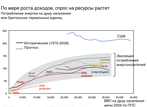 Попит на енергоносії в світі буде і далі рости за рахунок активного розвитку економіки Китаю (при прогнозі щорічного приросту ВВП на 6,8%), який забезпечує 40% нового світового споживання. Дослідження показують, що попит на енергоресурси зростає, поки доходи не сягають $ 15–20 тис. на одну особу населення. Потім економіка змінюється в бік розвитку сектора послуг, який є менш ресурсозалежним.