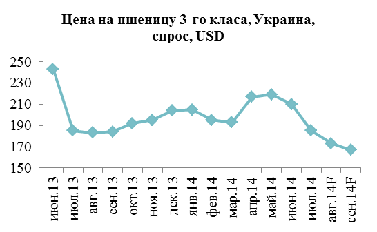 Цена пшеницы 3-го класса, долл. США / тонну (Украина, спрос)